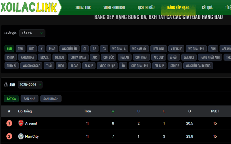 Đáp ứng nhu cầu của người hâm mộ trong nước, Xôi Lạc TV cũng là nguồn tra cứu bảng xếp hạng bóng đá hôm nay chính xác và nhanh chóng của V-League 1 và V-League 2. Thông tin về thứ hạng các đội bóng quốc nội, đặc biệt là các đội bóng hàng đầu như Hà Nội FC, Viettel hay Hoàng Anh Gia Lai, luôn được hiển thị nổi bật và cập nhật ngay sau khi các trận đấu kết thúc.