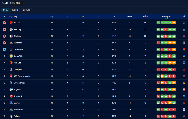Ví dụ, khi người dùng xem bảng xếp hạng, họ không chỉ thấy Arsenal đứng thứ 2, mà còn biết: Pháo thủ chỉ kém Man City đúng 2 điểm, nhưng đang có chuỗi 4 trận thắng liên tiếp – hiệu số bàn thắng vượt trội 7 bàn.