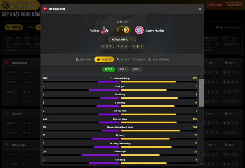 Nếu anh em chỉ muốn xem nhanh kết quả bóng đá trực tuyến, chỉ cần vào mục “Kết quả” là có thể theo dõi toàn bộ tỷ số các trận trong ngày.